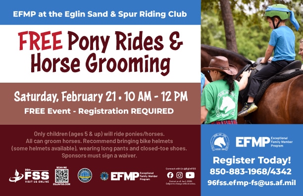 EFMP at the Eglin Sand & Spur Riding Club FREE Pony Rides & Horse Grooming Only children (ages 5 & up) will ride ponies/horses. All can groom horses. Recommend bringing bike helmets (some helmets available), wearing long pants and closed-toe shoes. Sponsors must sign a waiver. FREE Event - Registration REQUIRED Register Today! 850-883-1968/4342 96fss.efmp-fs@us.af.mil […] All Eglin's currently deployed families are invited to run, play, and decompress with your M&FRC Readiness Team at Unity Park on the third Saturday of each month. These special play dates are designed for families to spend time at the park with other deployed families, allowing opportunity for both kids and parents to spend a […] |
