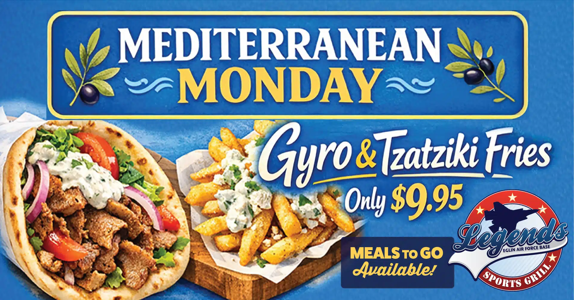 Featured Mediterranean MondaysLegends Sports Grill, Building 825 Legends Sports Grill, Building 825, Eglin Air Force Base, FL, United StatesLegends is proud to announce our newest Monday special, Mediterranean Mondays! Gyro & Tzatziki Fries $9.95 Gyro has lettuce, tomato, cucumber, red onion, feta cheese, and Tzatziki sauce served with Tzatziki fries topped with gyro meat, feta, and Tzatziki sauce, and topped with our house-made secret Mediterranean spice